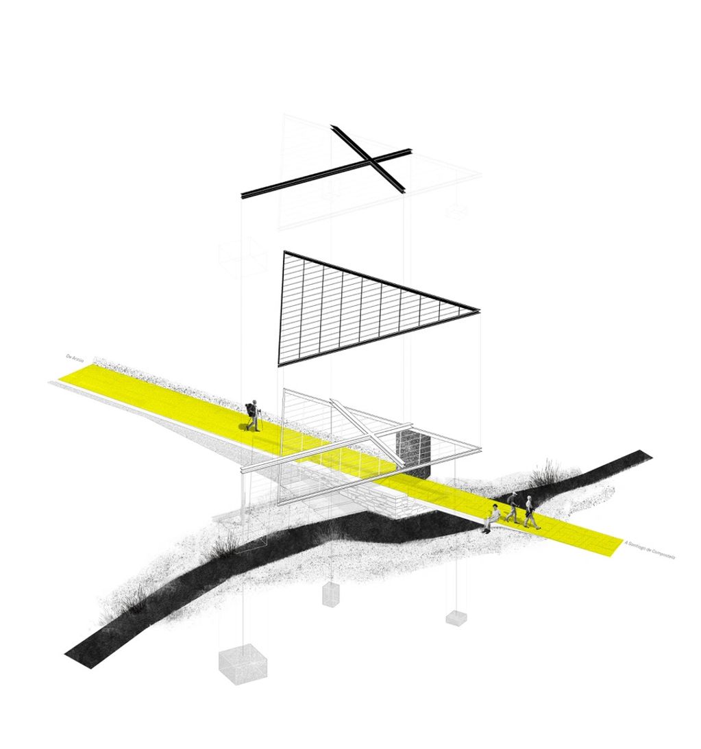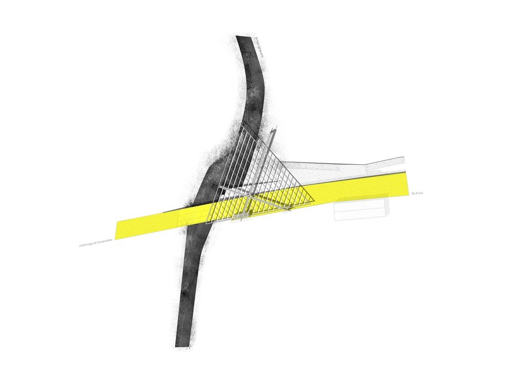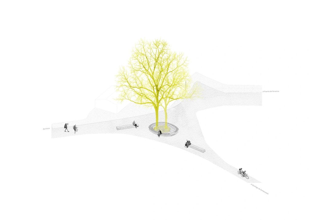 En la última etapa del Camino de Santiago, cerca del Alto do Outeiro, durante los 500 metros que la ruta atraviesa el núcleo rural de O Pino, el proyecto propone un descanso al peregrino para, tras sentarse a la sombra y remojar los pies, llegar más liviano a Santiago. Se plantea esta travesía con dos planos, el terrestre y el celeste, como el camino, que llamamos de la pisada (lo terrenal) y de